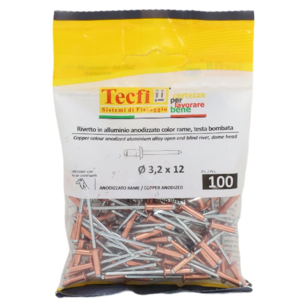 Perçina alumini anodizuara me ngjyrë bakri /çeliku, Ø 3,2 x 12mm , Bag 100