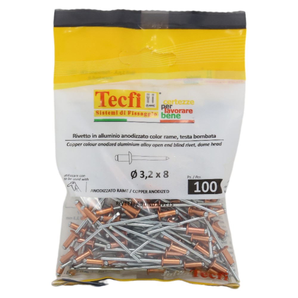 Perçina alumini anodizuara me ngjyrë bakri /çeliku, Ø 3,2 x 8mm , Bag 100