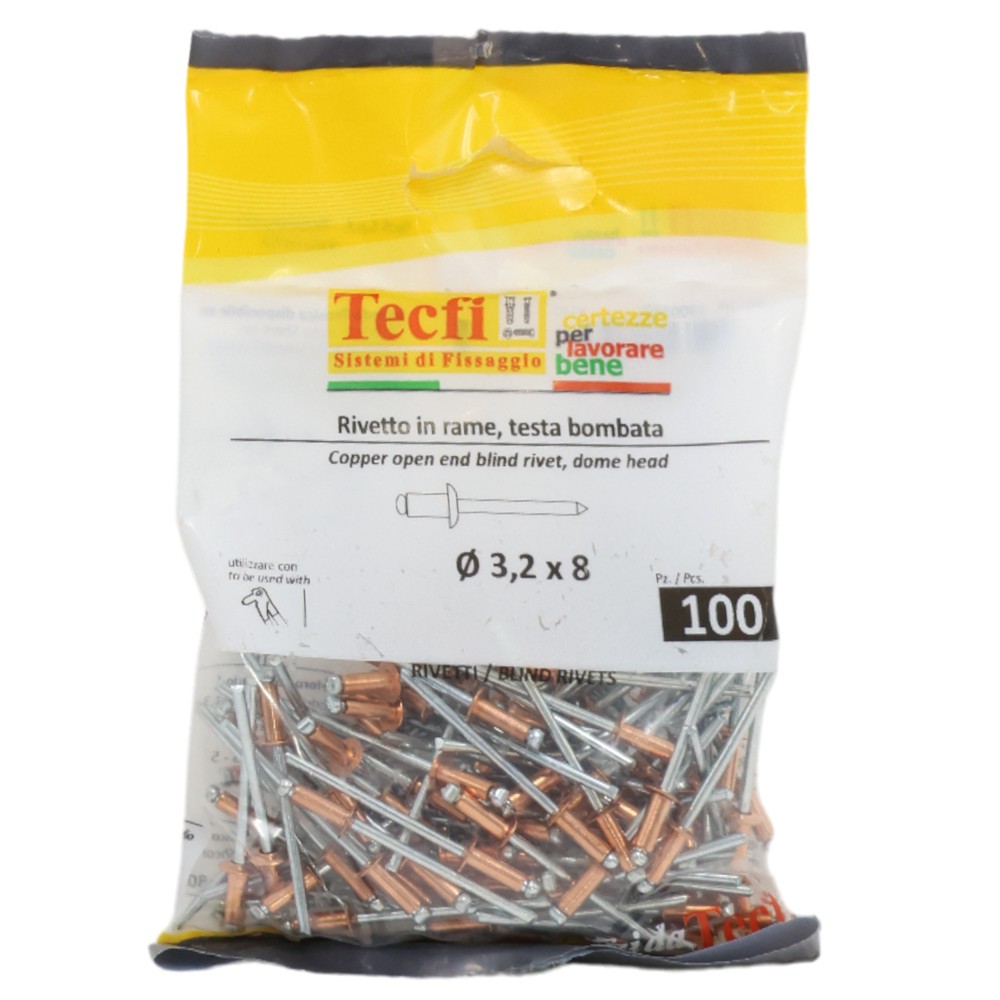 Open end dome head blind rivets, copper/zp steel, Ø 3,2x8mm, Bag 100
