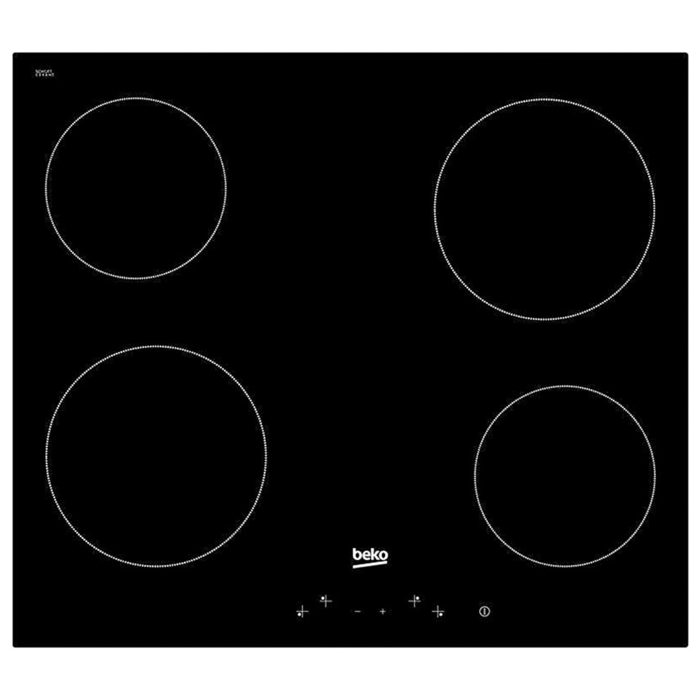 Pianurë Beko 58 cm në qeramikë qelqi të zezë me kontrolle me prekje. Konfigurimi i vatrave: 4 zona qeramike qelqi