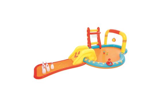 "Pishinë e vogël me rrëshqitëse dhe lojëra për fëmijë, prej materiali kloruri polivinili (PVC), me trashësi prej 0.27 mm, të përforcuar dhe të testuar paraprakisht, që e bën të qëndrueshme ndaj rrezeve të diellit, temperaturave të ftohta dhe gurëve apo objekteve të tjera të mprehta. Muret anësore mund të fryhen me ajër, gjë që parandalon lëndimin e fëmijëve gjatë lojës. Pishina përfshin lojëra si basketboll, bowling, boks dhe hedhje unazash. Përdoret si një mënyrë për argëtimin e fëmijëve, është praktike në përdorim, nuk zë shumë hapësirë dhe është e përshtatshme për t'u vendosur në ambiente të jashtme. Pastrohet lehtësisht nëpërmjet një valvule kullimi të vendosur në bazën e pishinës. Pishina ka përmasa 213x435x117 cm dhe kapacitet mbajtës të ujit prej 314 litrash. Mund të montohet dhe çmontohet lehtësisht për vetëm 30 minuta, duke përdorur një pompë ajri. Seti gjithashtu përmban: