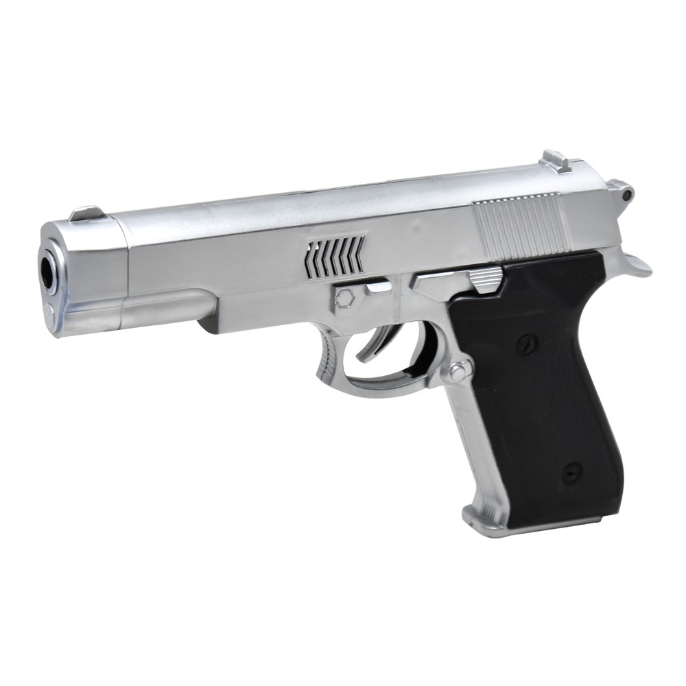 Pistoletë lodër për fëmijë, prej materiali plastik, me përmasa 24 cm, në ngjyrë të zezë dhe gri. Përdoret si një aksesor për veshje apo kostume të ndryshme, në rastet e festave si Halloween, karnavalet apo festa me kostume.