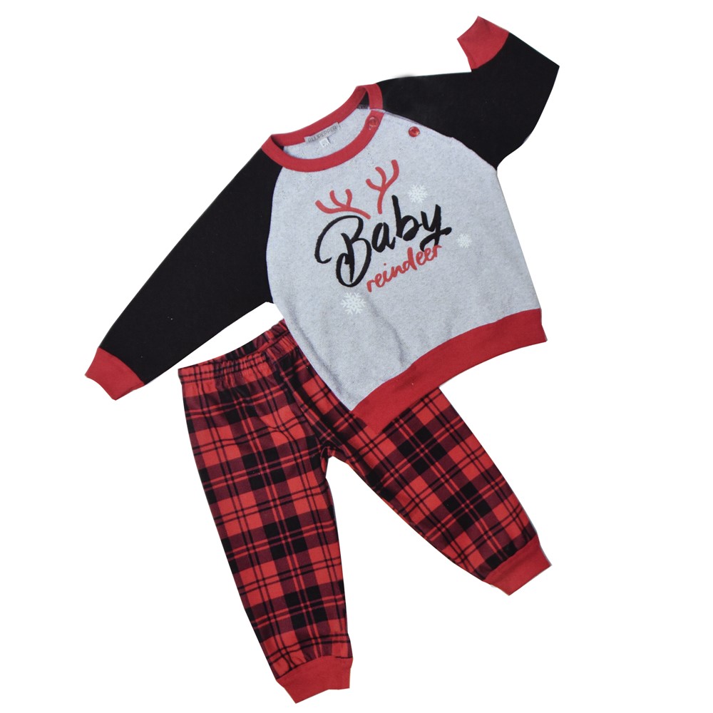 Pizhama christmas, per beba prej materiali pambuk me veti antibakteriale. Pizhamat përfshijnë një bluzë me jakë të rrumbullakët, me dy kopsa, dhe me mëngë të gjata, dhe një palë pantallona të gjata, në ngjyrë gri, kuqe, e të zezë. Ky produkt është i përshtatshëm për përdorim për Christmas.