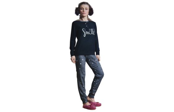 Pizhama për femra, modeli Jacquard, të cilat përfshijnë një bluzë me jakë të rrumbullakët, me tre kopsa dhe me mëngë të gjata, me shirit dhe manshetë, dhe një palë pantallona të gjata, në ngjyrë blu, prej materiali 70% poliestër dhe 30% pambuk, me veti hipoalergjike dhe antibakteriale, i cili nuk shkakton irritim në lëkurë, përthith lagështinë e tepërt, është higjienik dhe ka veti rregulluese të temperaturës së trupit. Ky produkt është i përshtatshëm për përdorim të përditshëm.