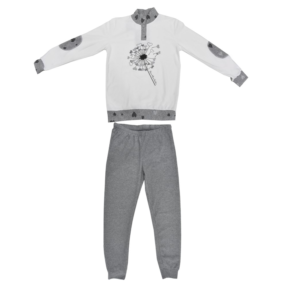 Pizhama për femra, prej materiali 65% poliestër dhe 35% pambuk, me veti hipoalergjike dhe antibakteriale, i cili nuk shkakton irritim në lëkurë, përthith lagështinë e tepërt, është higjienik dhe ka veti rregulluese të temperaturës së trupit dhe ritmit të zemrës. Pizhamat përfshijnë një bluzë me jakë të rrumbullakët dhe me mëngë të gjata, dhe një palë pantallona të gjata.