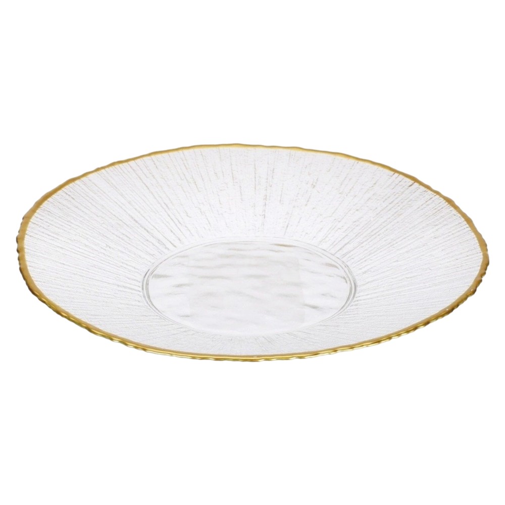Pjatë ëmbëlsire prej qelqi transparent me konturë floriri, me përmasa Dia. 21 x H 2.7 cm. Kjo pjatë elegante është perfekte për servirjen e ëmbëlsirave, pastave ose delikatesave të vogla me stil. Qelqi i pastër nxjerr në pah prezantimin e ushqimit, ndërsa kontura floriri i jep një prekje luksoze dhe sofistikuar. E qëndrueshme dhe e lehtë për t’u pastruar, kjo pjatë kombinon funksionalitetin me dizajn të rafinuar, duke e bërë të përshtatshme për përdorim të përditshëm ose raste speciale.