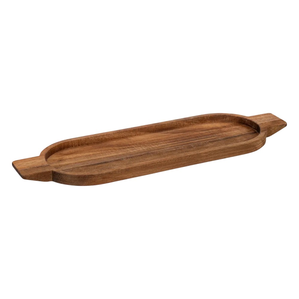 Pjatë për servirje prej druri akacie ne ngjyre kafe. Ka doreza për transport të lehtë dhe është ideale për të shërbyer meze ose djathra të vegjël në mes të tryezës tuaj.