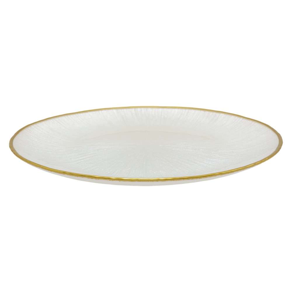Kjo pjatë servirje është një kombinim i elegancës dhe funksionalitetit, e krijuar nga qelq i bardhë me një kontur floriri që e bën të duket e veçantë dhe luksoze. Me një diametër prej 32 cm, kjo pjatë është e përshtatshme për t'u përdorur në ambiente të ndryshme, si darka formale, dasma, ose ngjarje speciale, duke i dhënë një prekje elegancë çdo tryeze. Konturimi floriri i shton një element sofistikate dhe delikatese, duke e bërë atë një aksesor të përsosur për çdo shërbim. Pjatë e bukur, që mund të shërbejë si dekor ose për përdorim të përditshëm në raste speciale.