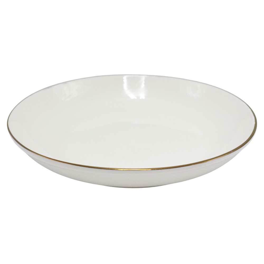 Kjo pjatë elegante prej qeramike të bardhë me konturë ngjyrë floriri është perfekte për servirjen e supave, kremrave apo pjatave të tjera të lëngshme. Me një diametër prej 18 cm, ajo ofron hapësirë të mjaftueshme për një shërbim të rehatshëm dhe të rafinuar. Konturet ngjyrë floriri i shtojnë një prekje luksoze dhe elegante tryezës tuaj, ndërsa materiali i qëndrueshëm e bën këtë pjatë një zgjedhje praktike dhe estetike për çdo rast.