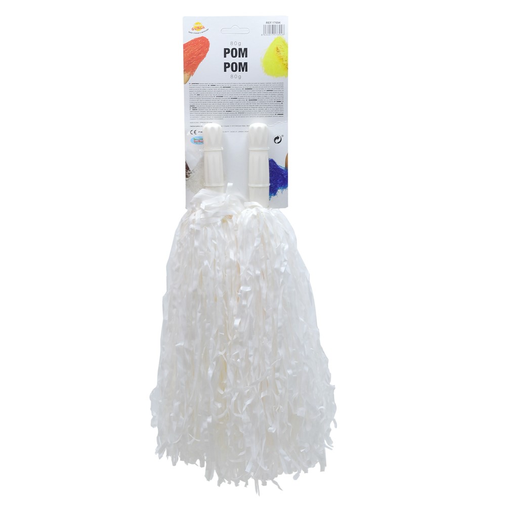 Pom poms prej materiali plastik, në gramaturë 80 gr, në ngjyrë të bardhë. E përshtatshme për tu përdorur në veshjet e nxitësve të tifozave.