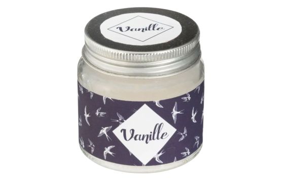 Po vlerësoni:Qiri aromatik me mbajtese qelqi, arome vanilje, ngjyre e badhe, 65 gr