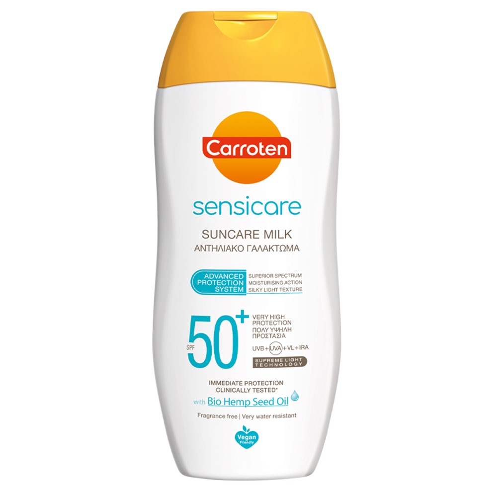 Qumesht kundër diellit, Sensicare SPF50+, ofron mbrojtje shumë të lartë ndaj diellit për lëkurën. E krijuar posaçërisht për lëkurë të ndjeshme, përmban vaj organik të farës së kërpit, duke ofruar kujdes dhe mbrojtje afatgjatë. Formula e butë, pa aromë është projektuar posaçërisht për të minimizuar rrezikun e një reaksioni alergjik. Sistemi 4-fish i mbrojtjes (UVB+UVA+VL*+IRA*), për mbulim të gjerë nga dielli nga spektri më i madh i rrezatimit të dëmshëm UV dhe infra të kuqe, përgjegjës për plakjen e parakohshme dhe dëmtime të tjera të lëkurës.