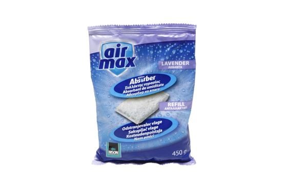 Qese praktike mbushëse për Air Max absorvues lagështire. Zvogëlon lagështirën e lartë të ajrit në dhoma të mbyllura me pak ose aspak ventilim. I përshtatshëm për anije, dollap rrobash, papafingo, bodrum, salla, kopësht, kuzhinë. Përhap një aromë të këndshme. 450 gr punon përafërsisht 3 muaj në një dhomë deri në 30 m ³. Një 450 ge mbushëse thith përafërsisht 0.5 litra ujë në varësi të temperaturës, lagështisë së ajrit dhe madhësisë së dhomës.