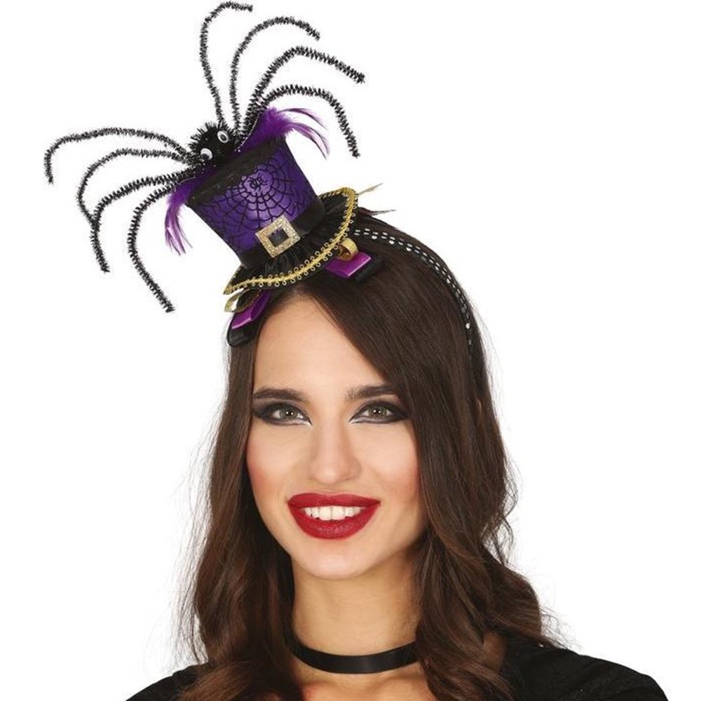 Kapelë vjollcë me një merimangë në shiritin e kokës. Një aksesor i lezetshem për kostumin tuaj të Halloween. Ideal për të plotësuar kostumin tuaj për halloween apo karnavale.