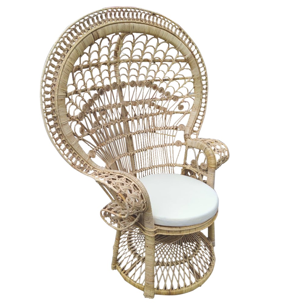 Karrige për verandë, modeli Peacock, me strukturë mbajtëse prej materiali ratani natyral (Plectocomia Elongata), me thurje të punuar në mënyrë artizanale, me përmasa 115x75x147 cm, me ndenjëse me diametër prej 50 cm, me pjesë anësore për mbështetjen e krahëve dhe me mbështetëse në formën e bishtit të palloit. Karrigia është e pajisur me shilte në formë rrethore, me veshje prej materiali akriliku dhe poliestre, në ngjyrë të bardhë, dhe me mbushje sfungjeri të butë. Materiali përbërës i strukturës është ekologjik dhe ka përmbajtje të lartë të parenkimës bimore, gjë që e bën më elastik, më të lehtë, më fleksibël dhe më të qëndrueshëm ndaj kushteve atmosferike. Ky produkt është i përshtatshëm për dekorimin e ambienteve të jashtme në kopshte, oborre, veranda, ballkone dhe tarraca, si edhe për ambientet e jashtme të hoteleve, bar-eve, restoranteve apo pishinave.