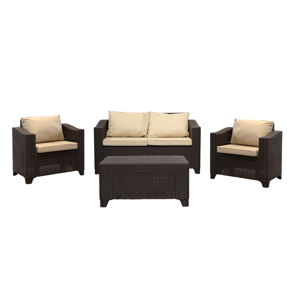 Ky set i mobiljeve është një zgjidhje e shkëlqyer për ambientet e jashtme si oborrat, ballkonet, apo edhe ambientet e brendshme si sallonet dhe verandat.