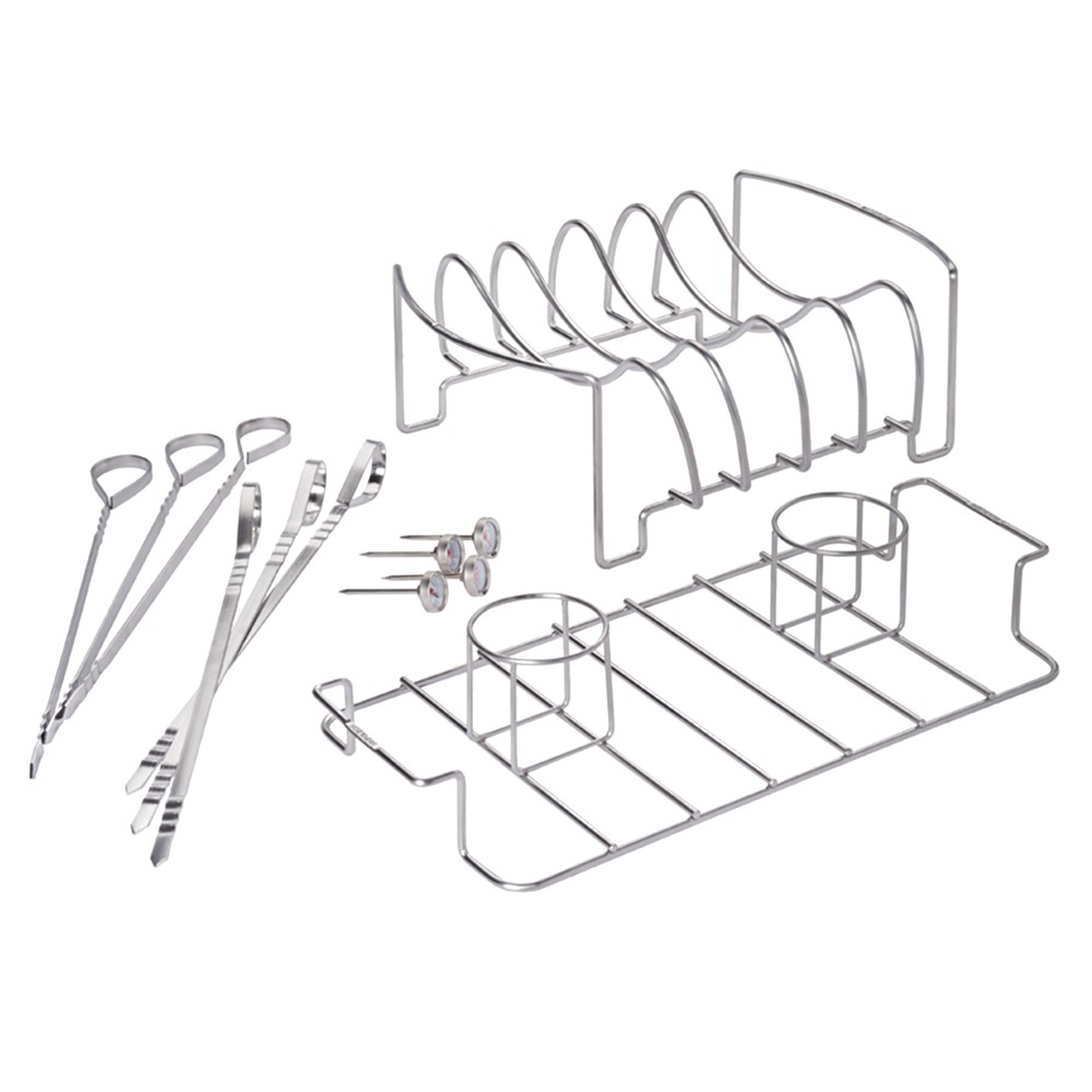 Set aksesorë pjekje për barbekju, prej material inoksi me 4 pjesë. Seti përmban një raft me brinjë, 6 hell kebabi inoksi, një raft për pjekjen e pulave dhe katër termometër mishi me butona. Ky set shumëfunksional është ideal dhe tepër praktik për gatimet me barbekju.