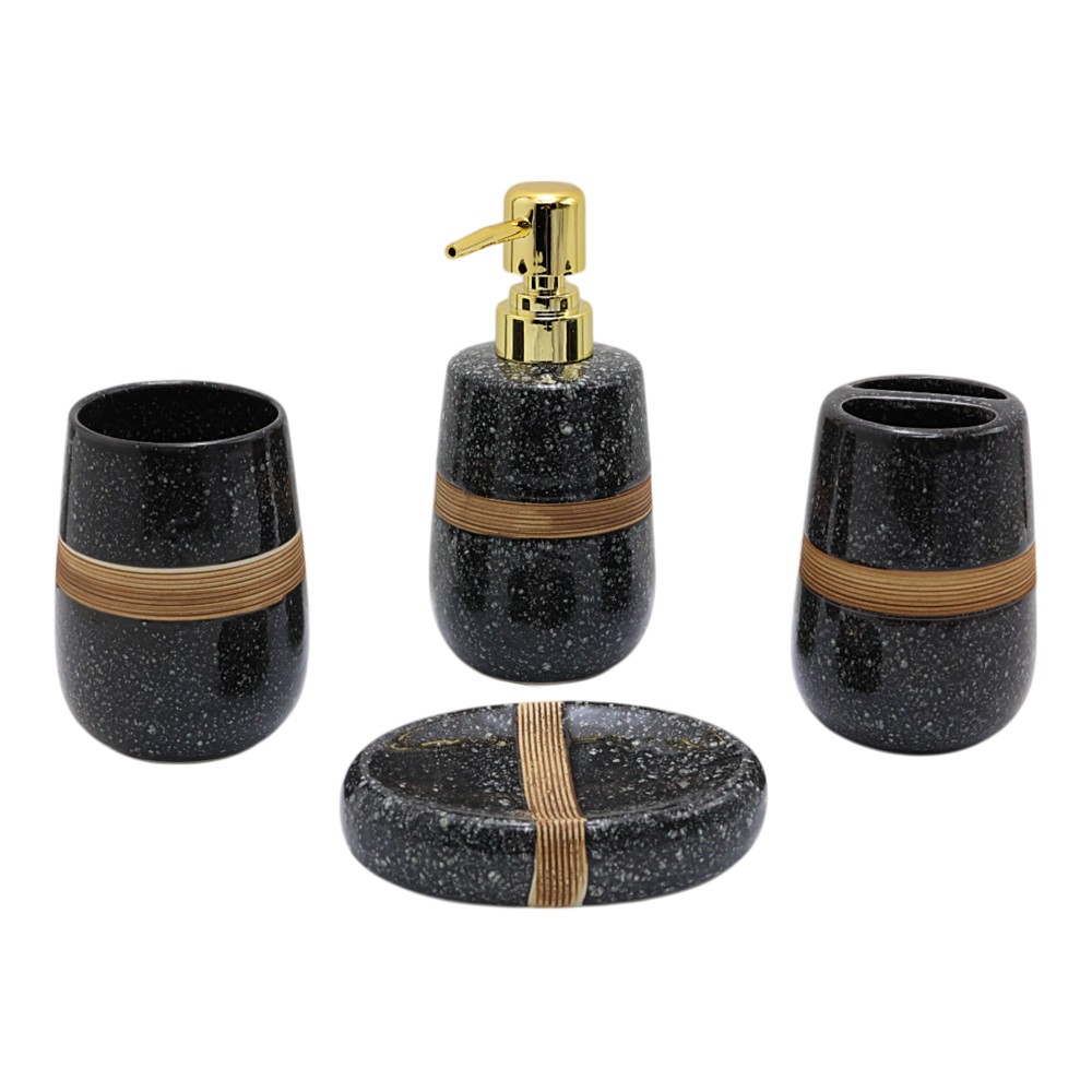 Seti i aksesoreve të tualetit "Stripe B" kompleton tualetin tuaj me të gjithë aksesorët e nevojshëm të mbështetur mbi mobilje. Prodhuar në qeramikë të zezë të cilësisë së lartë seti përbëhet nga një dispenser sapuni të lëngshëm, një mbajtëse sapuni, një mbajtese furcash si dhe një mbajtese pambuku. Falë ngjyrës së tij ky set përshtatet lehtësisht me të gjithë llojet e arredimeve.