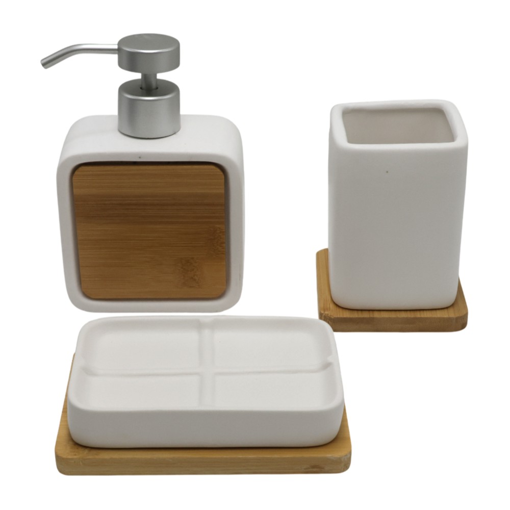 Ky set aksesorësh për tualet kombinon bukurinë natyrore të bambusë me qëndrueshmërinë dhe elegancën e qeramikës në ngjyrë të bardhë. Me dizajn minimalist dhe linja të pastra, ky set sjell një atmosferë moderne dhe të rafinuar në banjën tuaj. Materialet cilësore, të trajtuara për rezistencë ndaj lagështisë, sigurojnë funksionalitet dhe lehtësi në mirëmbajtje. Ky kombinim natyral dhe modern është ideal për ambientet me stil skandinav, minimalist apo për ata që dëshirojnë një prekje të ngrohtë dhe elegante në hapësirën e tyre.