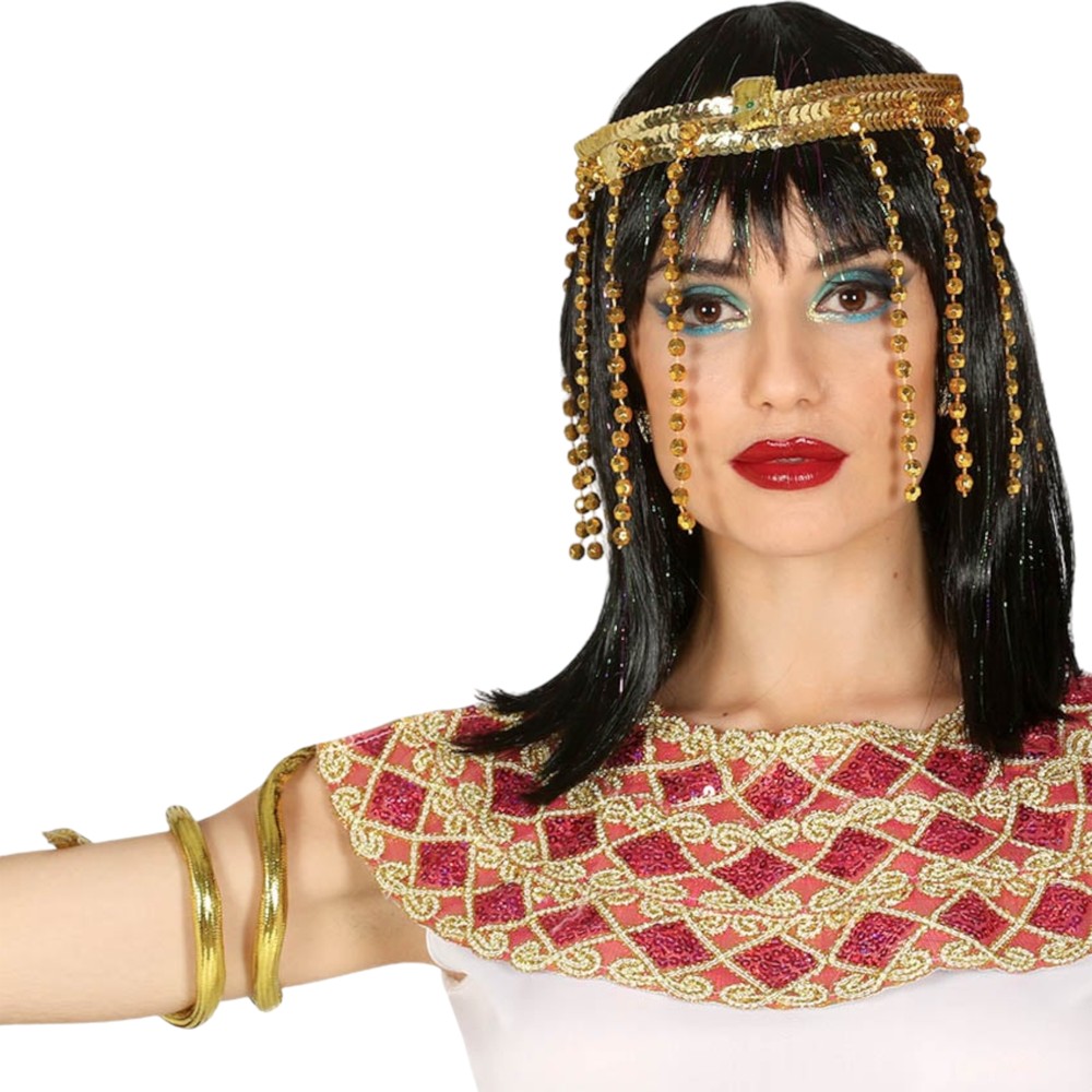 Ky set bizhuterie i inspiruar nga Kleopatra përmban një kurore elegante dhe një byzylyk të bukur, të dyja në ngjyrë ari. Dizajni i rafinuar dhe detajet delikate i japin këtij seti një pamje mbretërore, perfekte për festa, evente speciale ose si aksesor për kostumet tematike. E bëra nga materiale të cilësisë së lartë, kjo bizhuteri do t'ju ndihmojë të bëni një përshtypje të paharrueshme.