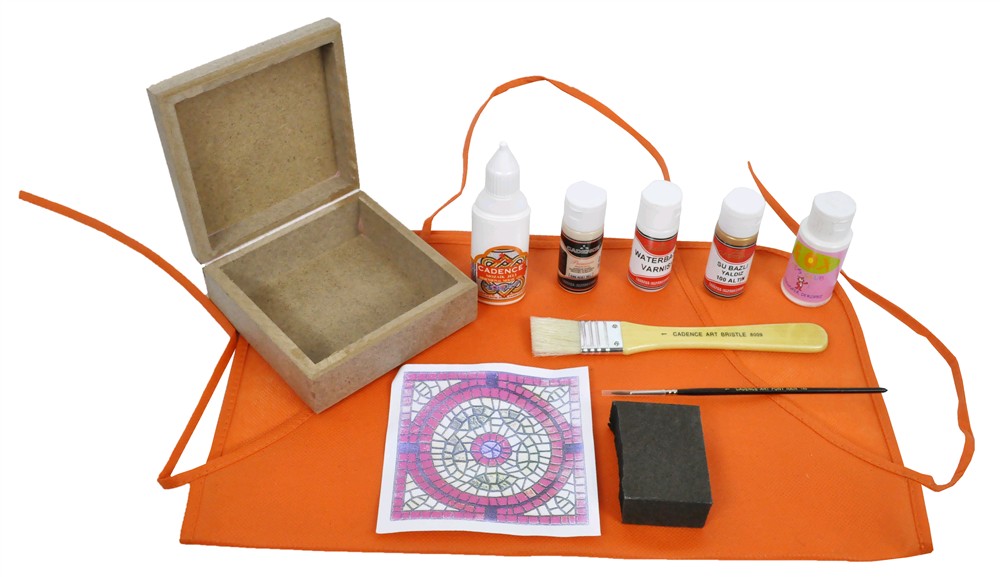 Produkt druri, akrilik bojë, bojë metalike, xhel mozaik, ngjitës,mozaik dizajn, zmerile, llak me bazë uji,furçë, furçë për kontur, tapa me bojë, shkop përzjerës, platforme.