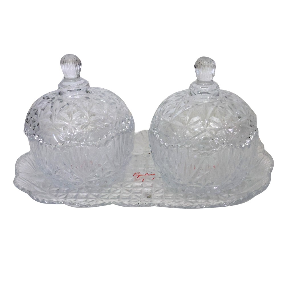 Set prej dy bonbonjerash të realizuara nga qelqi transparent me dimensionet 26x15.5 cm. Këto bonbonjere janë një pjesë e shkëlqyeshme për të paraqitur dhe shërbyer ëmbëlsira.