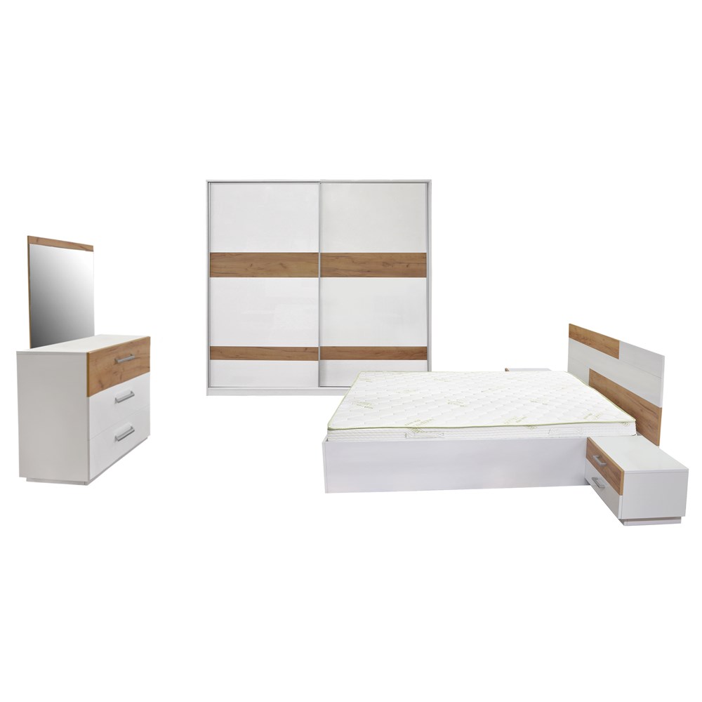 "Seti i dhomës së gjumit elegante LUNABELLA spikat në çdo dhomën. Kjo dhomë gjumi ofron një zgjidhje elegante magazinimi për një buxhet të vogël. E ndërtuar nga një struktur melamine dhe finitur arre dhe pana. Kjo dhomë gjumi përbëhet nga një komo me 3- sirtarë, 2 komodina, krevati dhe dollapi. Dollapi ka hapësira të bollshme magazinimi që mundëson ruajtjen lehtësisht të këmishave, xhaketave dhe veshjeve të tjera. Komoja ka 3- sirtarë për magazinimin e sendeve tuaja personale, dhe pjesa e sipërme mund të përdoret për vendosjen mbi të televizorit apo stolitë e ndryshme. Komodina do të shërbejë për vendosjen e ndriçuesit dhe orës me zile ndërsa hapësira shtesë sirtari do të shërbejë për mbajtjen e aksesorëve që ju duhen pranë krevatit. Krevati me kokën e lartë ofruar një përzierje të mirë të mbështetjes së fortë dhe rehatis maksimale.