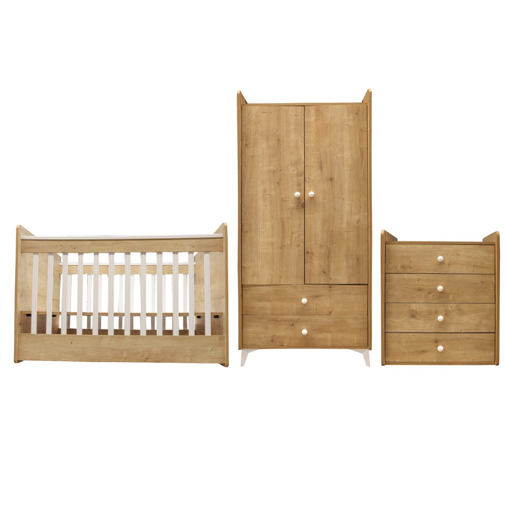 Set dhomë gjumi për fëmijë prej material melaminë, në ngjyrë natyrale. Ky set përfshin një krevat për fëmijë në përmasë 95x132x68 cm. Një dollap me kanate në përmasë 192x90x45 cm, si dhe një komo me sirtarë në përmasë 82x80x45 cm.