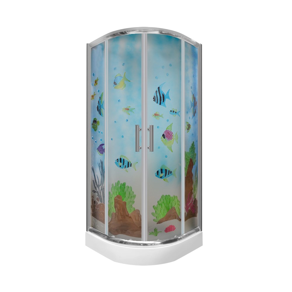 Seti "L'acqua'' kabinë+pllakë dushi ka një stil të sofistikuar që shton elegancën në dekorin e tualetit tuaj. Ky set përbëhet nga dyer me xham të temperuar i cili është katër deri në pesë herë më i fortë se sa xhami standard .Korniza prej alumini siguron qëndrueshmërinë e strukturës dhe është e lehtë për t’u montuar. Xhami me motive oqeani i kabinës dhe korniza e aluminit kombinohet shumë mirë me lavamanët prej xhami transparent, me dollape në ngjyrë bojëqielli dhe me pllaka të bardha dhe blu. Kabina në formë harkore mundëson shfrytëzimin më të mirë të hapsirës së tualetit.