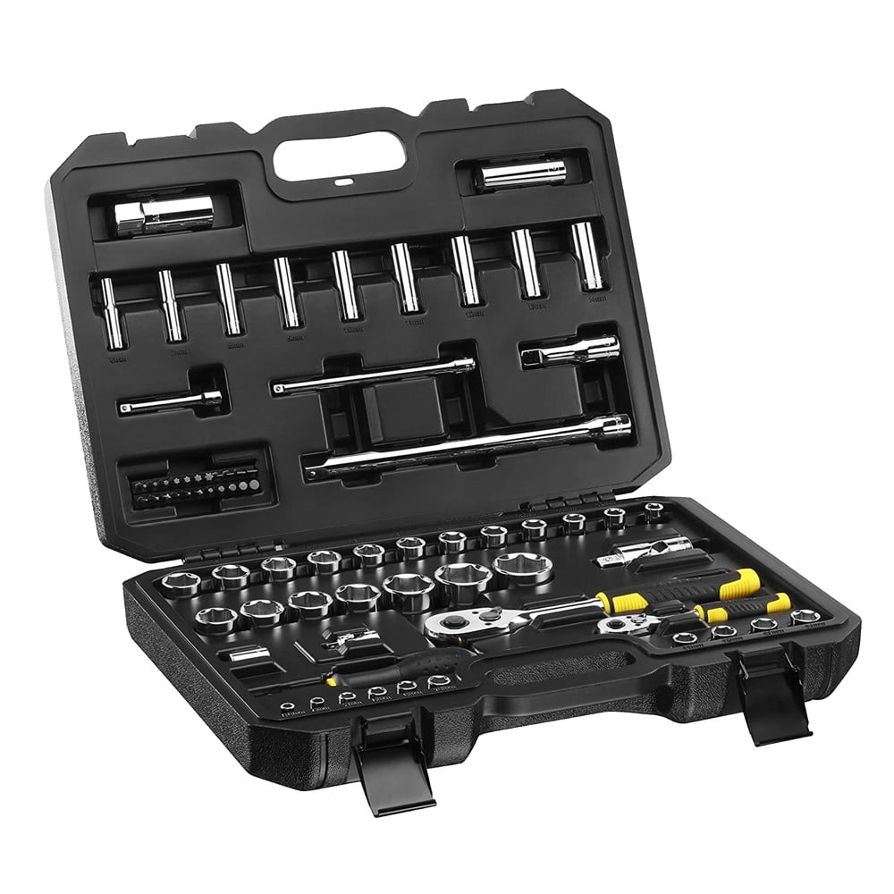 Ndertuar nga materiale te cilesise maksimal. Perbere ga celik special veglash, me rezistence te shkelqyer ndaj degradimit si pasoje e perdorimit intesiv dhe te vazhdueshem. Perbere nga : 1 leve 1/4 "me 72 dhëmbë, 10 çelësa me fole gjashtëkëndore, përfundim i pastër 1/4" (5.5-6-7-8-9-10-11-12-13-14 mm), 9 çelësa folesh gjashtëkëndore të gjata të pastra përfundimi 1 / 2 "(6-7-8-9-10-11-12-13-14 mm), 2 zgjatime 1 / 4" mm.75 dhe 125, 1 bashkim universal 1/4 ", 1 mbajtëse futëse 1 1/4", 1 mbajtëse 1 1/4 ", 22 maja 1 1/4" (Pcs 1-2-3, Ph. 1-2-3, hex. 3-4-5-6-7 mm, Torx 10-15-20-25-27-30-40, std 4-5-6-7 mm), 1 leve 1/2 "me 72 dhëmbë, 19 çelësa me fole gjashtëkëndore, përfundim i pastër 1/2" (8- 10-11-12-13-14-15-16-17-18-19-20-21-22-23-24-27-30- 32 mm), 2 çelësa për kandelat 1/2" 16 dhe 21 mm, 2 zgjatime 1 1/2" 75 dhe 250 mm, 1 bashkim universal në 1/1". Këllëf mat sintetik me mbyllje metalike. Doreza prej gome, amortizon sforcimet edhe ne punet me kerkuese. Ideale per profesionistet e fushes se riparimit dhe montimit mekanik.
