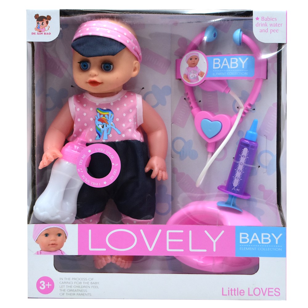 Set lodër për vajza, i cili përfshin një kukull, një biberon, një stetoskop, një shiringë dhe një oturak, prej materiali plastik, në ngjyrë rozë. Ky set ndihmon në zhvillimin e imagjinatës, zhvillimin e shqisave dhe zhvillimin e aftësive të të mësuarit tek fëmijët, përmes lojës në role. Materiali përbërës dhe boja nuk kanë përmbajtje toksike apo të dëmshme për fëmijët dhe produkti është i çertifikuar për siguri në përdorim. Ky produkt është i përshtatshëm për përdorim nga fëmijë të moshës mbi 3 vjeç.