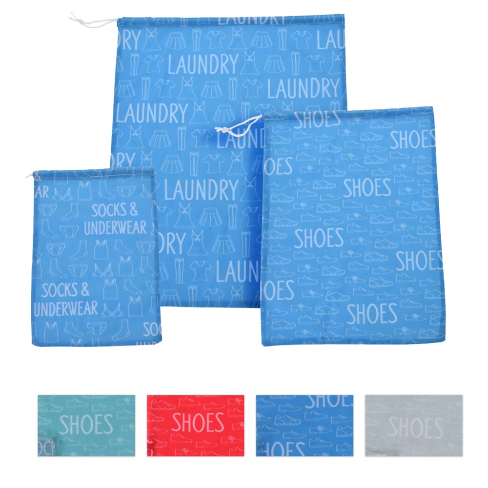 Set me 3 çanta udhëtimi, prej materiali poliestre, të pajisura me lidhëse, me përmasa 40x50 cm, 30x40 cm dhe 22x30 cm, në ngjyra të ndryshme. Seti përdoret për ruajtjen dhe transportimin e produkteve të higjienës personale, veshjeve dhe aksesorëve të ndryshëm, si dhe për organizimin e tyre në çantat e udhëtimit. Ky produkt është i lehtë dhe ka përmasa kompakte, që e bëjnë të përshtatshëm për t'u marrë me vete në udhëtime.