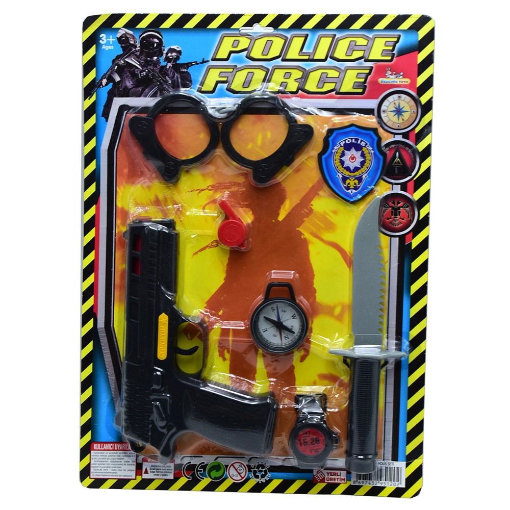 Set me pajisje policie për fëmijë, i cili përfshin një armë lodër, një distinktiv, një orë, një bilbil, një thikë dhe aksesorë të tjerë. Ky set ndihmon në zhvillimin e imagjinatës tek fëmijët, stimulon zhvillimin e aftësive motorike dhe ndihmon në zhvillimin e aftësive të të mësuarit dhe aftësive perceptuese, përmes lojës në role. Materiali përbërës dhe boja nuk kanë përmbajtje toksike apo të dëmshme për fëmijët dhe produkti është i çertifikuar për siguri në përdorim. Ky produkt është i përshtatshëm për përdorim nga fëmijë të moshës mbi 3 vjeç.
