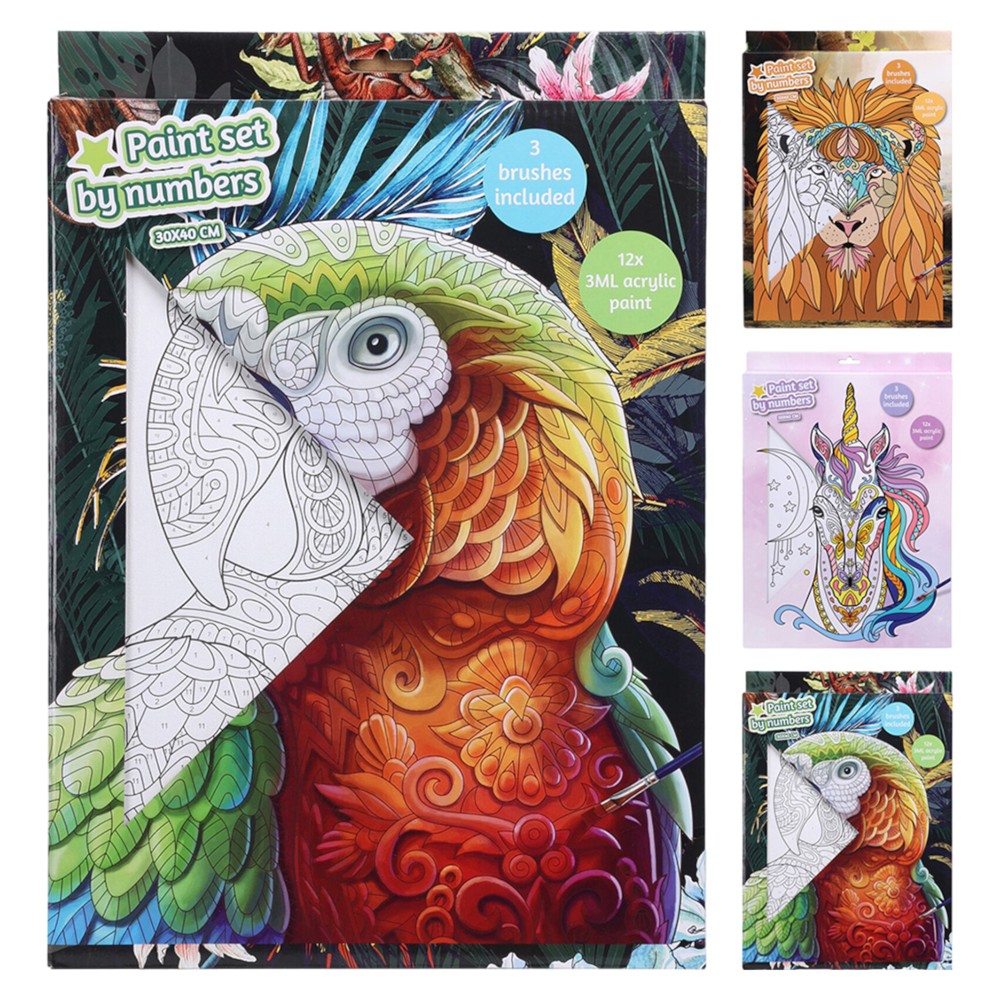 Seti përmban tre motive të ndryshme, duke përfshirë një luan, një njëbrirësh dhe një papagall. Çdo motiv shfaqet në një kornizë me përmasa 30x40cm, prej 100% dru pishe të certifikuar nga FSC. Seti përmban tre furça në madhësi të ndryshme me doreza plastike, duke përfshirë furçat me përmasa 12.5 cm, 16.5 cm dhe 17.5 cm gjatësi.Do të merrni 12 tuba që përmbajnë secila 3 ml bojëra akrilike në një larmi ngjyrash duke përfshirë jeshile të hapur, jeshile, vjollcë, blu të hapur, blu, të zezë, të verdhë, portokalli, të kuqe, rozë të lehtë, rozë dhe rozë të errët.