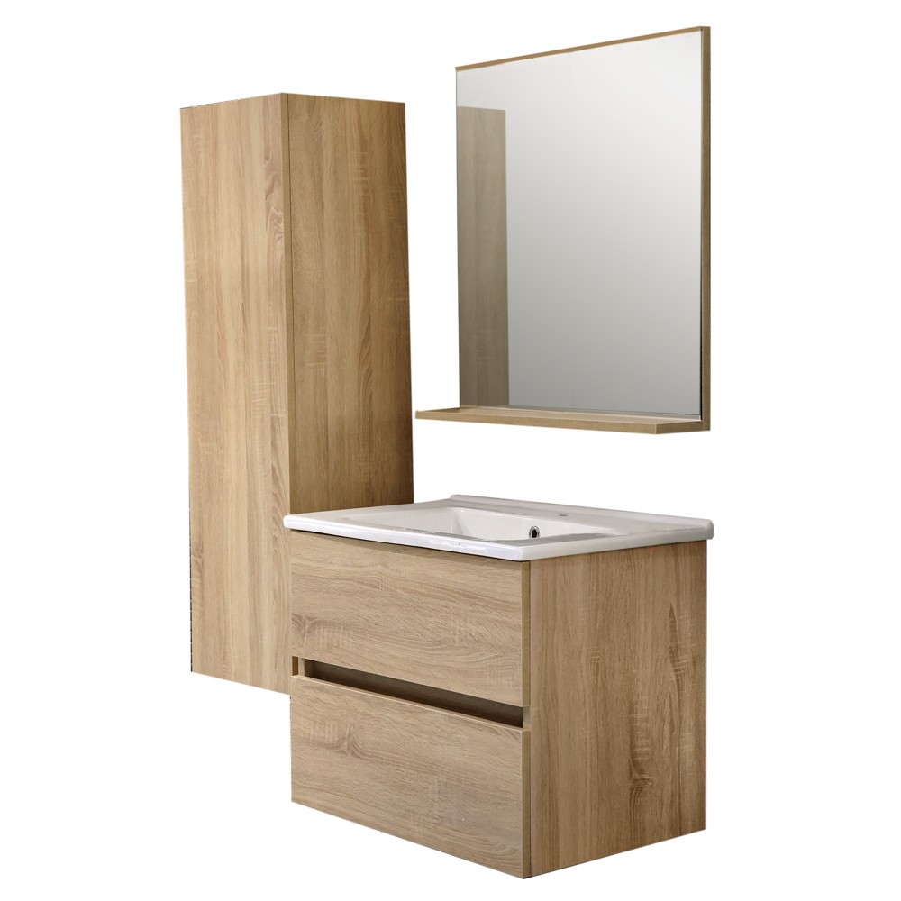 Duke tërhequr vëmendjen me dizajnin e tij modern, mobilja e tualetit' 'Leaf 65'' është e rafinuar dhe elegante me dollapët e tij funksionale të ruajtjes dhe magazinimit, pasqyra fine me raft siguron një pamje të bukur dhe shume moderne per tualete me hapesira mesatare. Materiali i mobiljeve prej MDF është rezistent ndaj lagështirës. Ngjyra e bardhe kompozohet shumë mirë në ambiente me pllaka moderne njëngjyreshe dhe me motive të ngjyrave të ndryshme. Seti përfshin lavamanin, dollapin poshtë tij dhe pasqyrën, të gjitha të paketuara për një montim shumë të thjeshtë dhe të shpejt nga cilido.