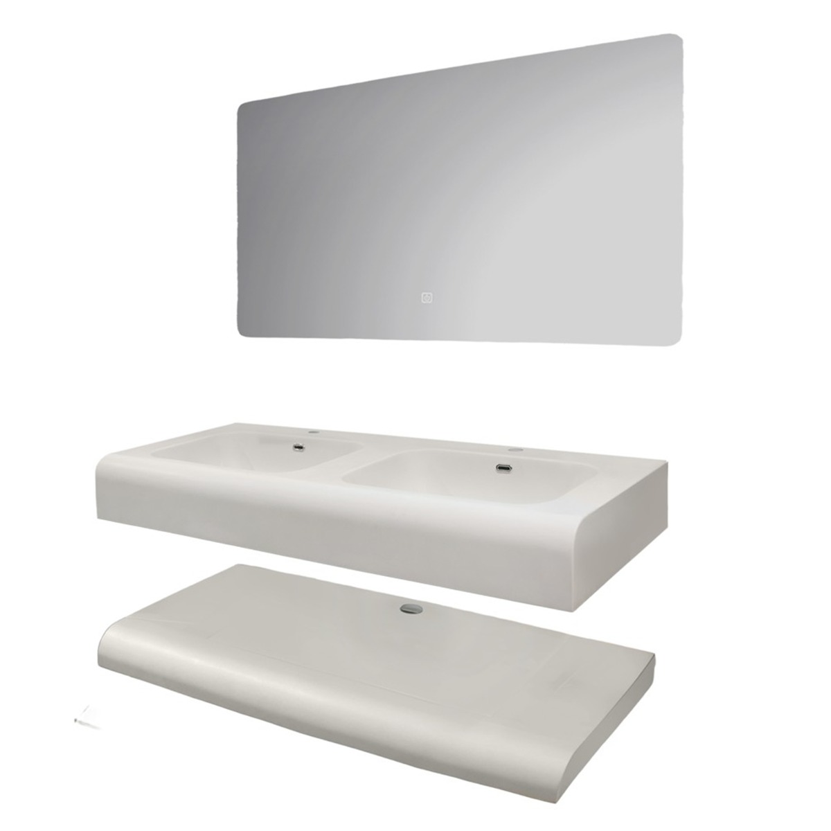 Set mobilje tualeti me montim në mur, i ndërtuar nga material gur i sintetizuar, duke ofruar një strukturë të qëndrueshme dhe rezistente ndaj lagështirës. Me përmasa W 120 cm x D 50 cm x H 15 cm dhe ngjyrë të bardhë të pastër, ky set është i përshtatshëm për çdo hapësirë, duke ofruar funksionalitet dhe një pamje moderne. Pasqyra LED ka përmasa W 120 cm x H 60 cm, dhe është projektuar për t'u integruar në mënyrë të përshtatshme me bangon, duke krijuar një pamje të pastër dhe të organizuar. Gjithashtu hapësira midis dy bangove mund të përdoret për të organizuar peshqirë, ose elementë të tjerë të domosdoshëm në tualet. Ky dizajn i montuar në mur kursen hapësirë dhe lehtëson pastrimin e zonës poshtë bangos, duke kontribuar në një ambient tualeti më të pastër dhe më të rregullt.