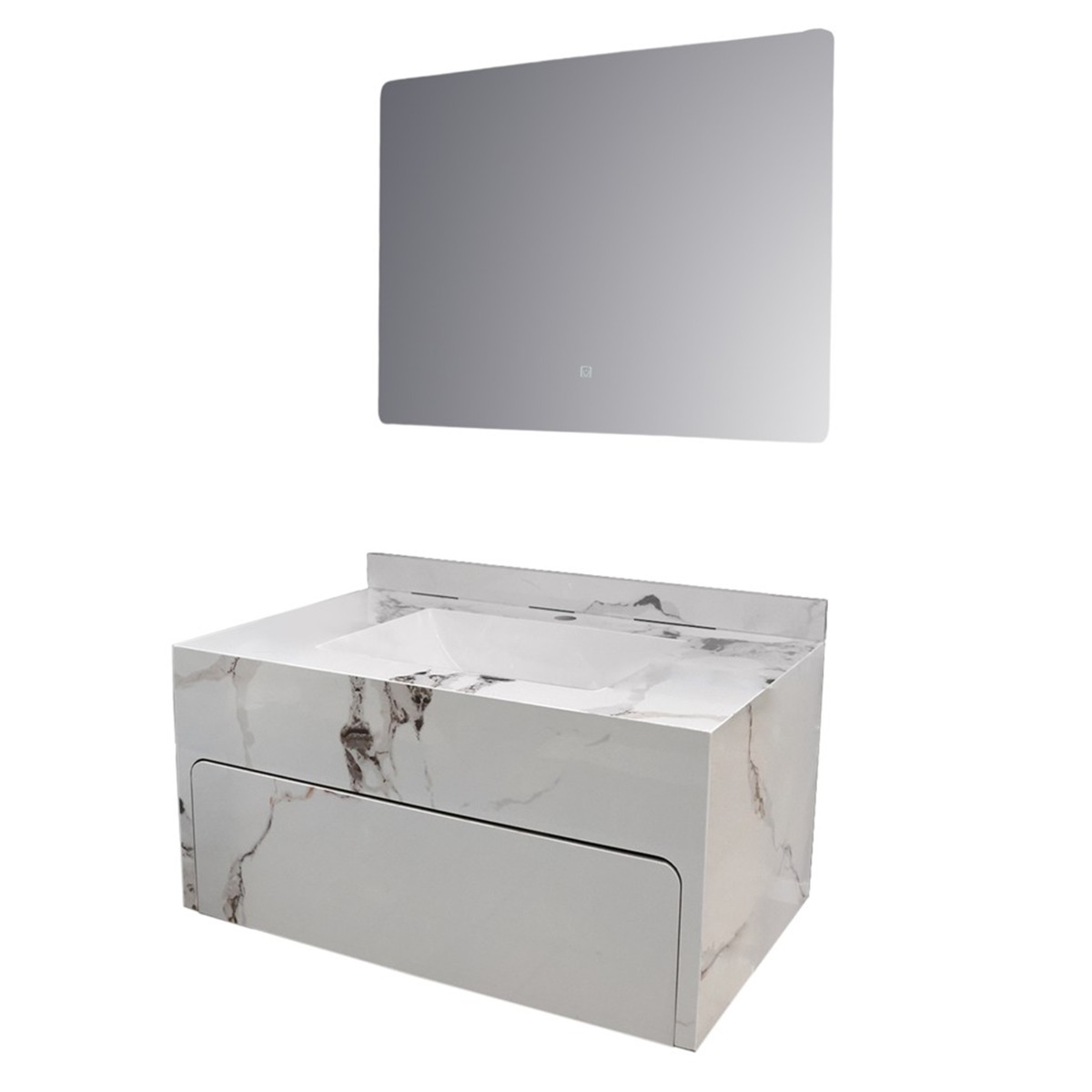 Set mobilje tualeti me montim në mur, i ndërtuar nga material gur i sintetizuar, duke ofruar një strukturë të qëndrueshme dhe rezistente ndaj lagështirës. Me përmasa W 80 cm x D 50 cm x H 40 cm dhe me efekt mermeri, ky set është i përshtatshëm për çdo hapësirë, duke ofruar funksionalitet dhe një pamje moderne. Pasqyra LED ka përmasa W 80 cm x H 60 cm, dhe është projektuar për t'u integruar në mënyrë të përshtatshme me bangon, duke krijuar një pamje të pastër dhe të organizuar. Bangoja e poshtme është e pajisur me një sirtar të integruar, duke ofruar hapësirë të bollshme për organizim. Ky dizajn i montuar në mur kursen hapësirë dhe lehtëson pastrimin e zonës poshtë bangos, duke kontribuar në një ambient tualeti më të pastër dhe më të rregullt.