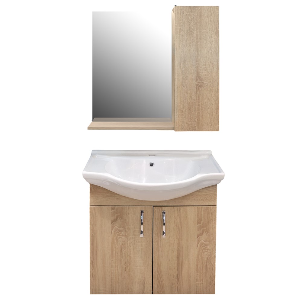 Seti i Mobilje tualeti'' SQUARE 65 '' montim në mur, ngjyrë dru arre prezanton modelin elegant që gjallëron tualetin tuaj. Lavamani i bardhe porcelani ofron stil në dekorin e tualetit tuaj, lehtësi për t’u pastruar duke siguruar një pamje të bukur dhe shume moderne per tualete me hapesira mesatare. Materiali i mobiljeve prej MDF është rezistent ndaj lagështirës. Ngjyra e bardhe kompozohet shumë mirë në ambiente me pllaka moderne njëngjyreshe dhe me motive të ngjyrave të ndryshme. Seti përfshin lavamanin, dollapin poshtë tij dhe pasqyrën, të gjitha të paketuara për një montim shumë të thjeshtë dhe të shpejt nga cilido.