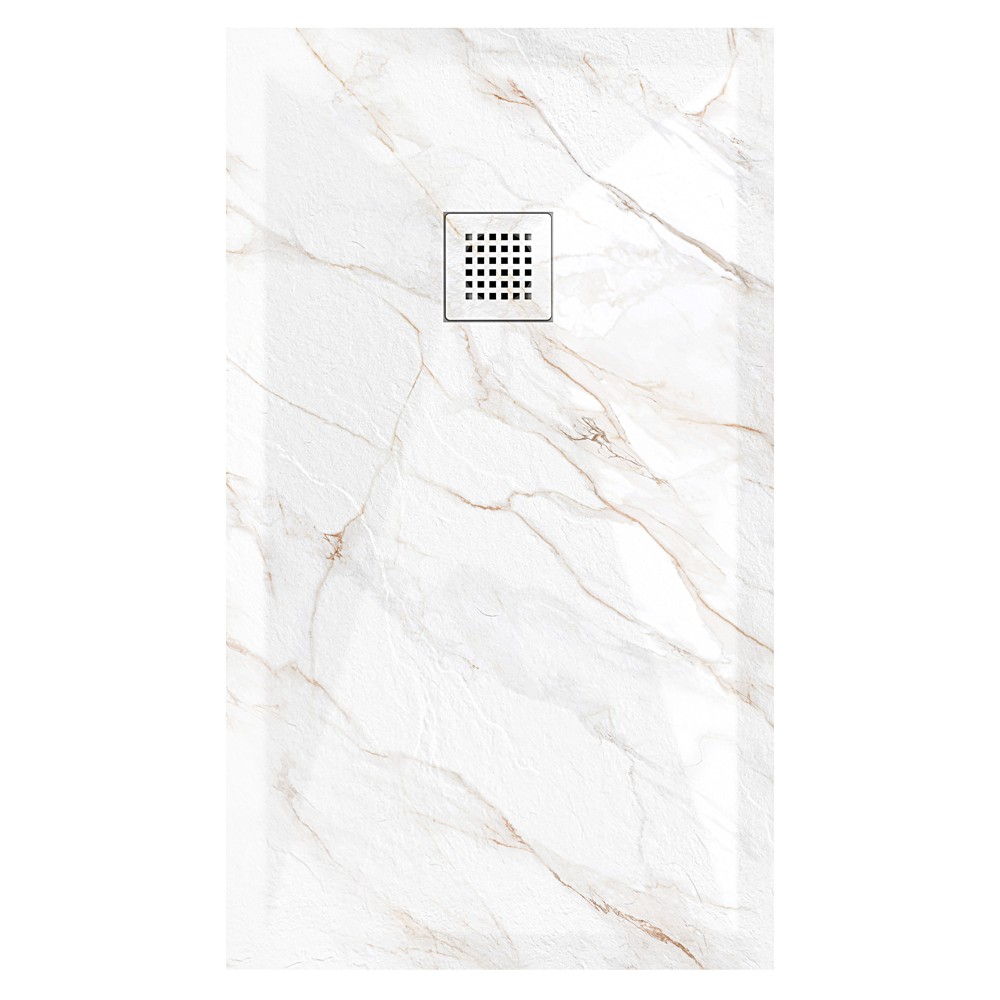 Pllakë dushi e prodhuar nga kombinimi i materialeve rezinë cilësore dhe karbonat kalciumi, që i jep fortësinë e duhur dhe rezistencë ndaj dëmtimeve. Ky kombinim është gjithashtu edhe antibakterial, që është një nga cilësitë kryesore të kësaj pllake dushi. Gjithashtu, sipërfaqja me efekt guri e bën këtë pllakë të jetë kundra rrëshqitjes, që e bën shumë të sigurt përdorimin e saj. Kjo pllakë dushi vjen në ngjyrë të bardhë dhe me detaje mermeri që i jep një pamje luksi. Përmasat janë 120x80xH2.5 cm por mund të përshtatet shumë lehtë pasi mund të pritet në përmasat e nevojshme. Në set përfshihet gjithashtu edhe pileta e shkarkimit.
