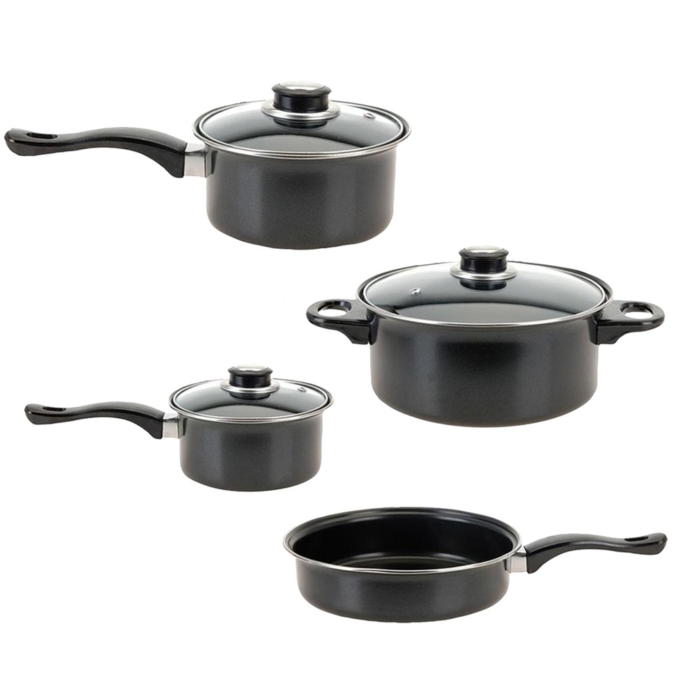 Seti i enëve të gatimit është prej çeliku të karbonit me një sipërfaqe mbuluese që nuk ngjit. Me këtë komplet që nuk ngjit mund të përgatisni pjata të ndryshme për familjen tuaj. Duke qenë se kompleti i gatimit është kompakt, është i përshtatshëm edhe për ta marrë me vete. Këto enë janë të përshtatshme vetëm për vatra gazi.Seti përfshin 3 tenxhere me kapacitet 1.4 L dhe 1.5 L së bashku me kapakët e tyre dhe një tigan me kapacitet 2.5 L.