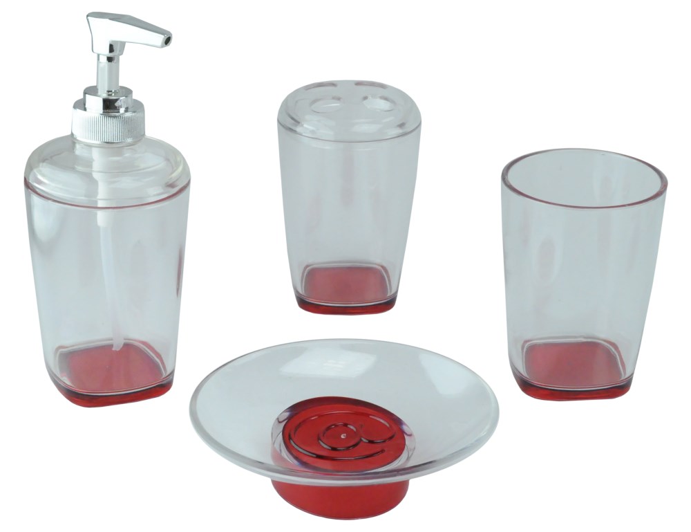 Shtojini elegancë tualetit tuaj me setin e aksesorëve "All 4 Bath". Me katër artikuj të ndryshëm, pjesë e ketij seti ju mund të krijoni kombinime të shkëlqyera për një ambjent të personalizuar. Seti i aksesorëve të tualetit "All 4 Bath" është një zgjidhje efikase për një shumëllojshmëri tualetesh. Materiali i lehtë plastik, transparent kombinuar me bazën në ngjyrë të kuqe, mundëson përdorim praktik dhe përshtatshmëri në ngjyrë për tualetet. Dizajni plot stil dhe eleganca në formë, si dhe kombinimi i ngjyrave të setit e bëjnë këtë produkt të përshtatshëm për tualete bashkëkohore duke iu dhënë më tepër hijeshi këtyre ambienteve.