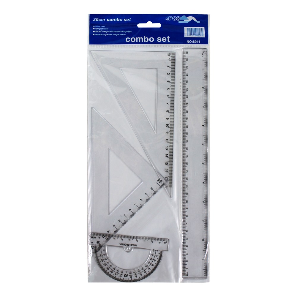 Set spline 4pc, 2 trekendeshe, 1 vizore 30cm dhe 1 raportor. Ato jane një instrument shumë i dobishëm në gjeometri, matematikë apo vizatim. Ato mund të kryejë matje deri në 30 cm ose ju ndihmojne për të bërë vija të drejta apo kënde të drejta.