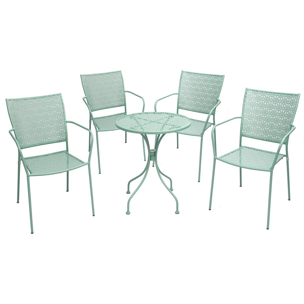 Një set fantastik tavoline me 4 karrige. Ngjyra shumë e veçantë bojqelli si dhe dizajni shumë i veçantë e bëjnë këtë një nga setet e parapëlqyera për tu përdorur në ambjentet tuaja të gjelbëruara si veranda, kopshte, ballkone etj. Seti ka një materjal metalik shumë të lehtë por njëkohësisht shumë rezistent. Falë përmasave ideale ky set nuk do t'ju zerë shumë vend dhe do t'ju jap relakisn e dëshiruar.