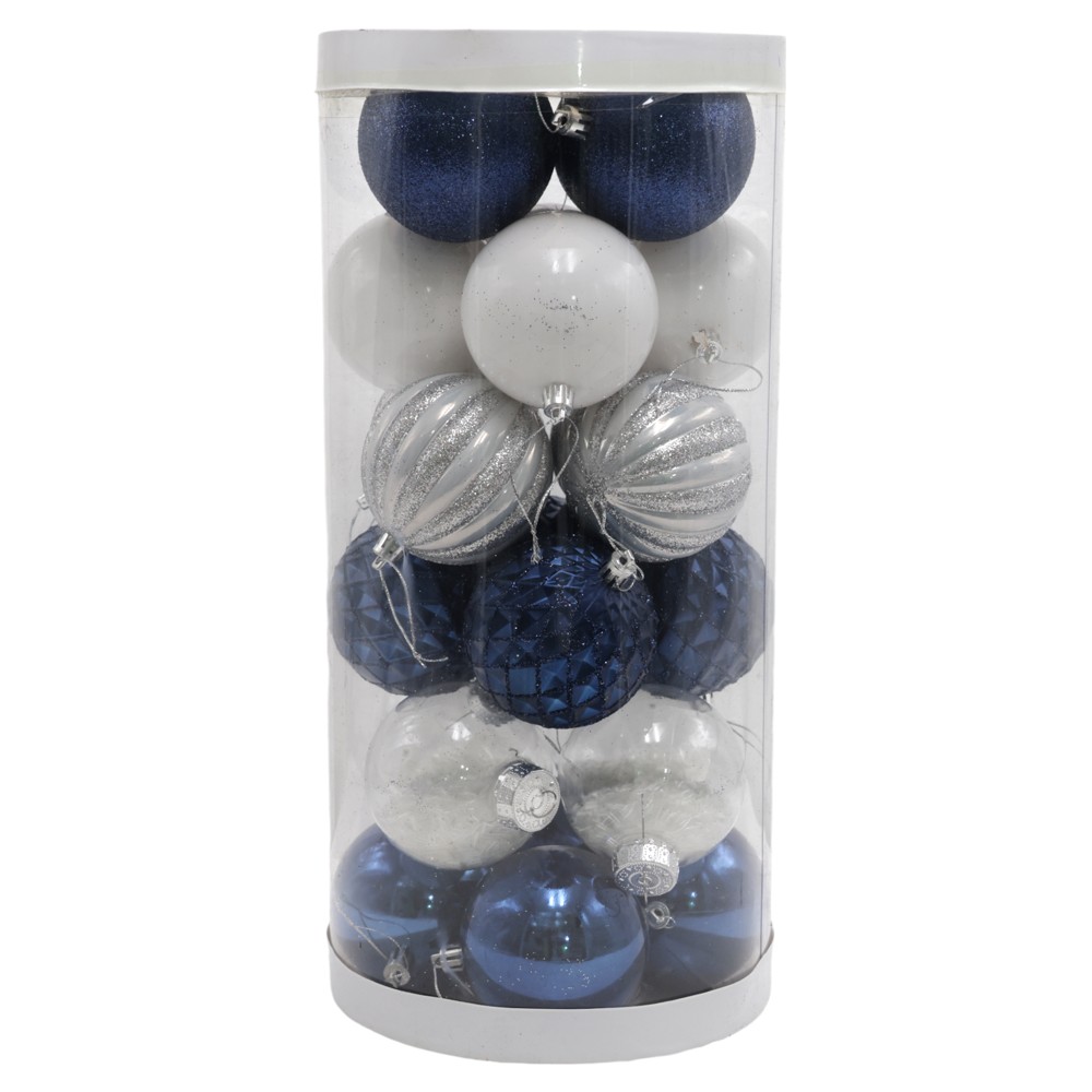 Po vlerësoni:Sfere dekoruese (pk 24), plastike, blu, e bardhe, silver, 6 modele, 8 cm