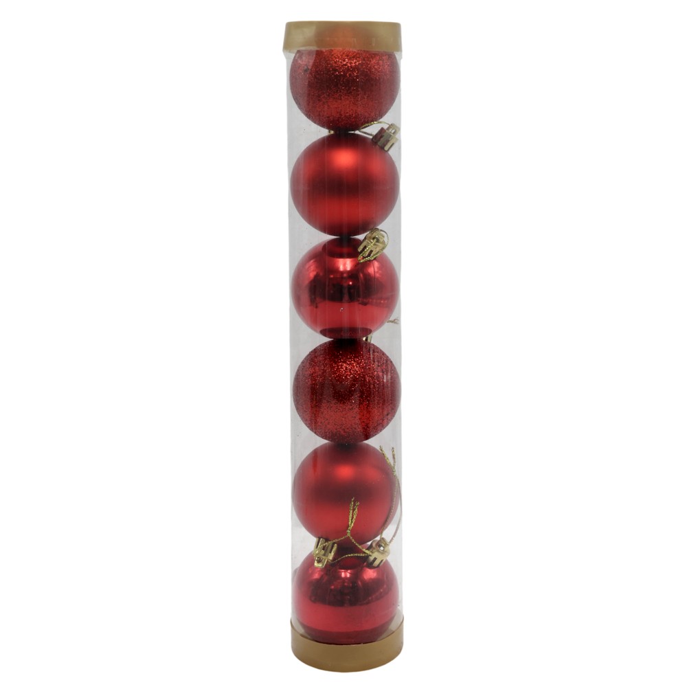 Christmas baubles (pk 6), plastic, red, 3 models, 6 cm