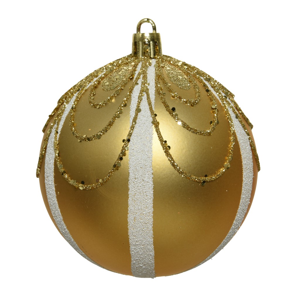 Sferë dekoruese, prej materiali plastik që nuk thyhet, me diametër prej 8 cm, në ngjyrë gold, me shirita në ngjyrë të bardhë pa shkëlqim dhe me xixa, e pajisur me një shirit në pjesën e sipërme, i cili lejon që të vendoset si një lodër dekoruese në pemën e Krishtlindjeve. Përdoret për dekorimin e ambienteve të ndryshme të brendshme gjatë festave të Krishtlindjeve dhe Vitit të Ri. Ky produkt është i përshtatshëm për përdorim në ambiente familjare dhe për përdorim profesional, nga kompanitë e organizimit të eventeve.