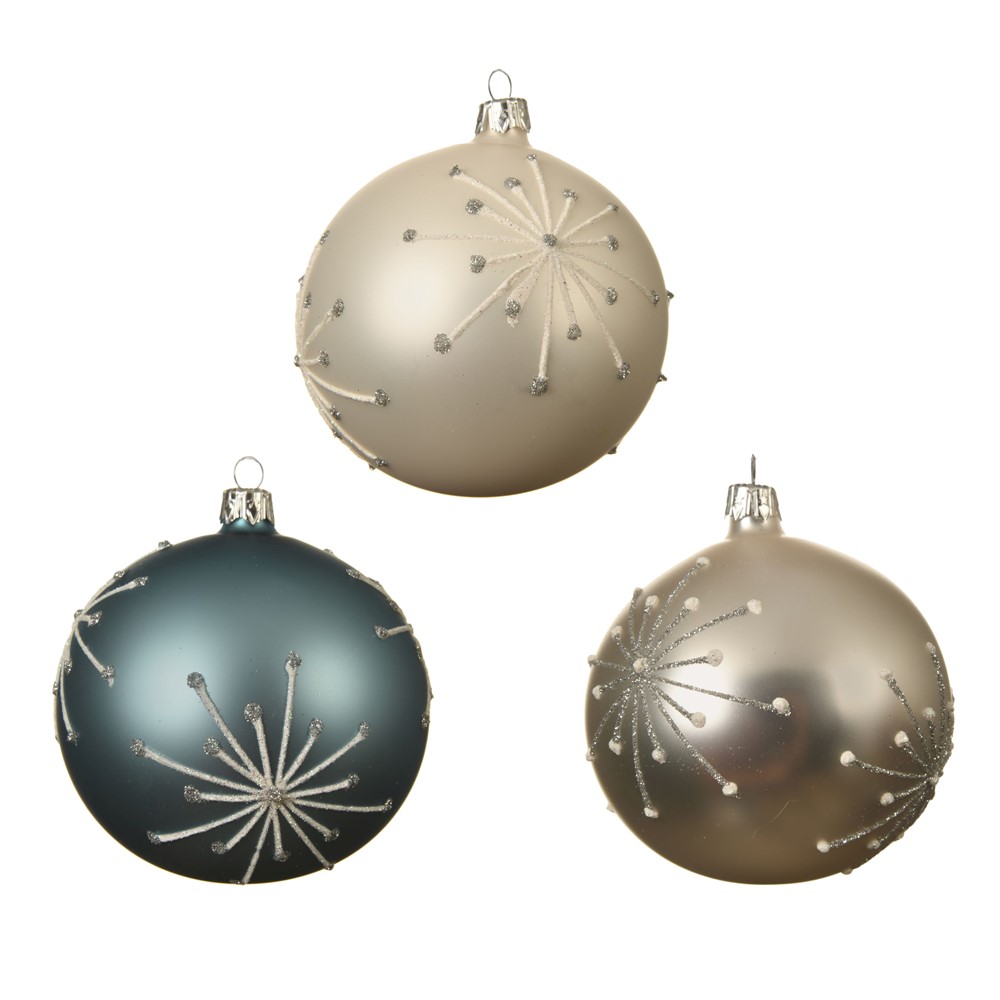 Sferë dekoruese prej qelqi me ngjyra të ndryshme me diametër 10 cm. Ky aksesor dekorues përdoret për të zbukuruar pemen e vitit të ri, duke i shtuar magjinë e festave ambjenteve tuaja festive të fundvitit.