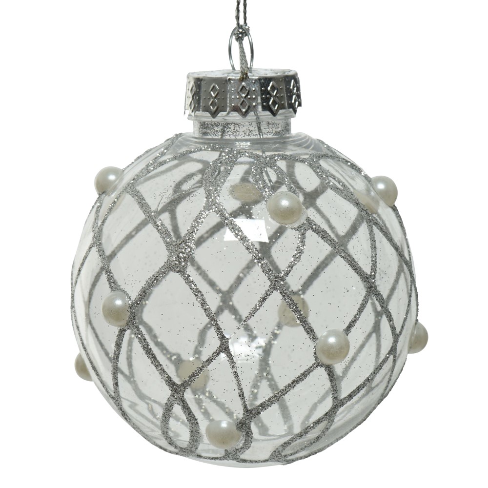 Sferë dekoruese prej qelqi ngjyrë transparente me diametër 8 cm. Ky aksesor dekorues përdoret për të zbukuruar pemen e vitit të ri, duke i shtuar magjinë e festave ambjenteve tuaja festive të fundvitit.