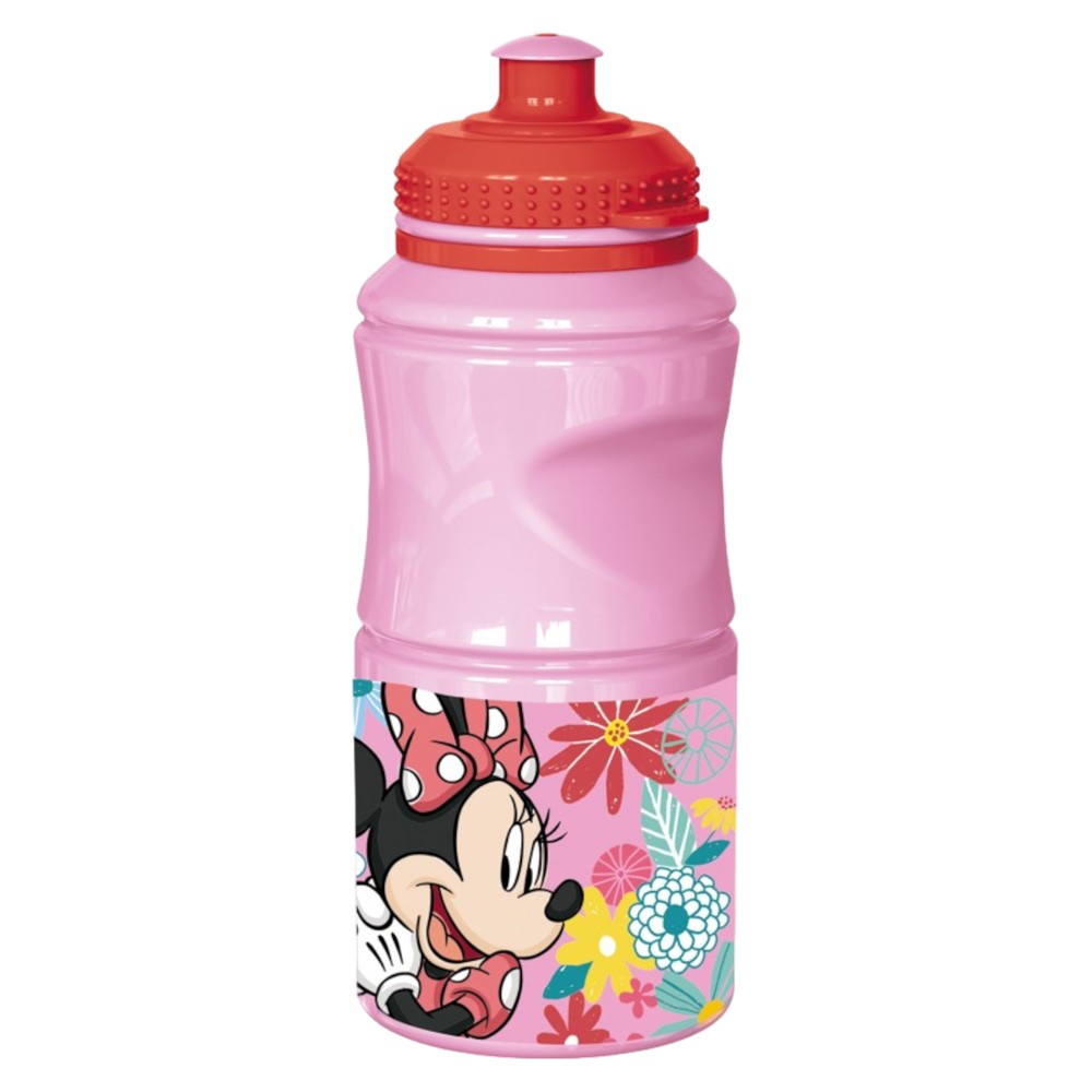Shishe uji 380 ml për fëmijë, frymëzuar nga një prej personazheve më të famshëm Minnie Mouse. Produkti është i lehtë për t'u përdorur falë formës ergonomike, kapakut kundër derdhjes dhe brezit kundër rrëshqitjes. Modeli i shishes së ujit është i ngjashëm me ato që përdorin çiklistët, ndaj mundëson hidratim të sigurt për të vegjlit gjatë gjithë ditës dhe mund t'i shoqërojë në çdo aktivitet që kryejnë: sport, shkollë, kohë të lirë. Prania e kapakut kundër derdhjes e bën gjithashtu shumë të sigurt, duke shmangur rrjedhjet.
