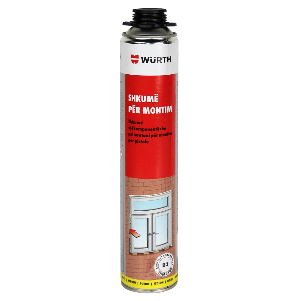 Përdoret për shkumë njëkomponentëshe poliuretani per montim, me ekspandim të madh, për montimin e kornizave të dyerve dhe dritareve si dhe për plotësimin dhe mbushjen e vrimave. Izolim të nxehtësisë dhe zhurmës. Përbërja: shkumë njëkomponentëshe poliuretani, ngjyrë gri, e cila ngurtësohet me ndihmën e lagështisë. Vetitë: rezistente ndaj mykut, nxehtësisë, ujit dhe shumë kimikateve. Nuk është rezistente ndaj rrezeve UV. Ekspandimi deri në 35 Litra. Ngiitet mirë në materiale siç janë: betoni, mermeri, guri, druri, PVC e fortë dhe metali. Nuk ngitet në polietilen, silikon, yndyrë dhe materiale të njëjta. Vend-aplikimet: vend aplikime tipike të shkumës njëkomponentëshe PU për përdorim me pistoletë ose pipetë janë: montimi i kornizave të dyerve dhe dritareve prej druri, plastike dhe metali. Izolimi termik i gypave të ujësjellësit, vaskës, bolierit dhe sistemeve ftohëse, mbushjen e boshllëqeve, vrimave dhe çarjeve të cilat nuk mund të mbyllen me materiale tjera. Mënyra e aplikimit: sipërfaqet duhet të jenë të njoma (uji të jetë perthithur). Largoni pjesët që nuk janë të qëndrueshme. Sipërfaqen e pastroni nga yndyrnat dhe pluhuri. Para përdorimit tundni mirë kanën, së paku 20 herë. Vidhoseni gypin plastik ose pistoletën. Temperatura optimale e kanës para përdorimit është +15 deri në +35° C. Temperatura minimale e ambientit është +5°C. Lagia intensive është e domosdoshme nëse lagështira e ajrit është nën 35%. Nëse mbushim hapësira të mëdha, preferojmë mbushje në shtresa (trashësia e shtresës të jetë maks. 2 cm). Pas përfundimit kanën e vendosni në pozitë vertikale. Të dhëna teknike: nuk ngjitet në prekje pas 12 min, mund të preket pas 40 min, tërësisht e thatë pas 12 orësh, zgjerimi maksimal shtesë 15%, klasa e ndezjes B3, dendësia e shkumës 12-16 kg/ m3. Kana është enë nën presion dhe nuk duhet të ekspozohet në dritë të diellit dhe temperaturë mbi +50°C.